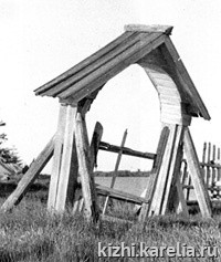 Чуть ближе к деревне стоял маленький крест под резным навесом. Рядом с ним, со стороны часовни находилась ограда из резных зубцов, основание которой было выложено из камня. Ворота были массивные, тоже резные. В 30-е годы XX века крест, ворота и деревянную часть ограды покрасили масляными красками.