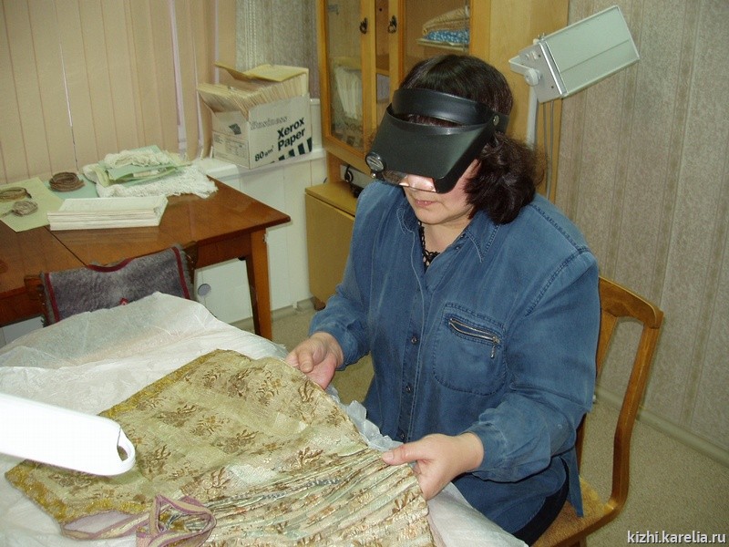 В глазах Елены Михайловны Наумовой горит огонек любви к своему делу, а руки помнят миллионы стежков, которые оживляли костюмы XVII-XIX веков. Елена Михайловна – начальник отдела реставрации фондовых коллекций, при этом хранитель коллекции тканей. Профессия у нее редкая. В нашей республике есть такие мастера, но только Елена Михайловна – художник-реставратор текстиля первой категории. За время работы в Кижах она вернула к жизни множество изделий из ткани. И они стали такими, что никто не поймет, что вещь была реставрирована! Это и рубашки, и сарафаны (заонежские, поморские, карельские), и юбки, и всевозможные головные уборы.