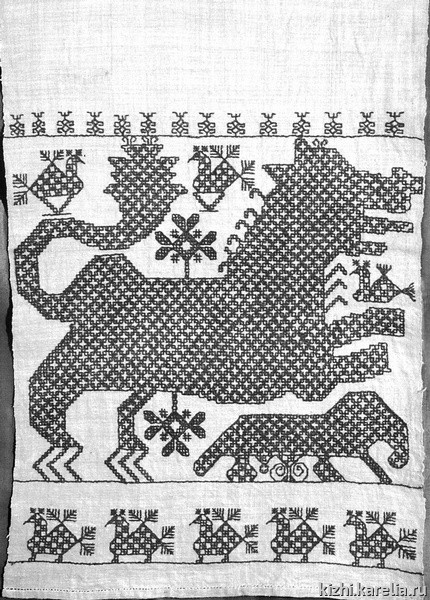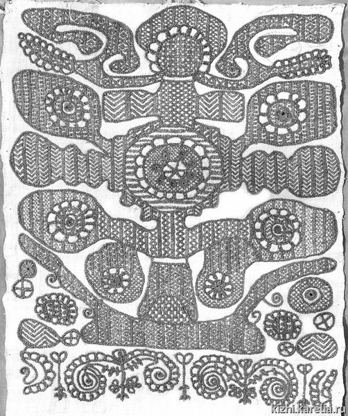 Заонежье — регион, расположенный в северо-западной части Онежского озера, включающий в себя Заонежский полуостров с прилегающими к нему островами — Кижскими шхерами. В конце XIX — начале XX веков более трети мужского взрослого населения Заонежья уходило на заработки в города. Тесные контакты со столицей способствовали формированию специфической крестьянской культуры, отмеченной сильным влиянием большого города. Не случайно, в начале XX века такой вид ремесла, как вышивка, приобрел в Заонежье промысловое значение.