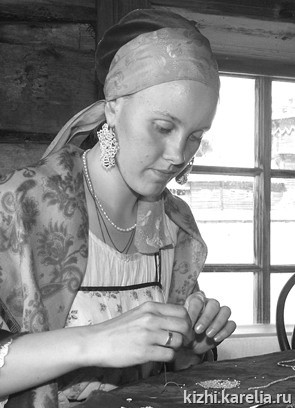 - В первый раз я побывала на острове, когда мне было всего 9 месяцев. И затем каждое лето я жила там с родителями. Внештатным работником музея официально я стала работать уже в 11 классе, проводя экскурсии на русском и финском языках. Во время проведения очень известной выставки в 1993 году «Женский головной убор», которую готовила моя мама, я представляла золотное шитье. Мы тогда работали с О. И. Ворониной. Из этой работы в 1994 году и появилась наша «ожившая экспозиция». Честно говоря, я никогда не думала, что могу работать где-то в другом месте. Работать в музее очень трудно, но остров притягивает. И хотя у меня нет нормальных условий проживания на острове, я не могу привезти туда детей и супруга, все знают, что я уже отсюда никуда не денусь…. Всему, что я умею, я научилась на острове. Недавно моя шестилетняя дочь спросила меня: «И что, я тоже буду работать как ты? «Не знаю, с каким чувством она это произнесла, но она видит, как я работаю, все время в костюме, постоянно видит прялки — бусики. Она уже понемногу начинает приобщаться к тому, что делаю я. И она уже задумывается о своей судьбе и ее связи с островом. На мой взгляд, в музее происходят изменения. Хорошо, что теперь каждая коллекция находится у одного специалиста. Это позволяет более тщательно с ней работать. Жаль, что медленно решается вопрос о проживании сотрудников на острове.