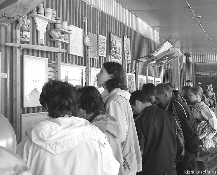 Многие победители конкурса «Кижский сувенир» представляли работы на ярмарке ремесел. Резьба по дереву, плетение из бересты, бисероплетение, кружева, вышивки, мягкие игрушки,— для всего нашлось место на веселой ярмарке. Выделяющаяся из всех группа мальчишек из Суоярви на глазах у публики изготавливала деревянные ложки, украшая их резьбой. Пять победителей конкурса из студии резьбы по дереву, которой руководит Вячеслав Леонидович Истоминский, представляли коллектив, в котором занимаются 250 ребят. Учитель труда средней школы уже восьмой раз привозит детей на музейный праздник, все восемь лет студийцы являются лауреатами и победителями конкурсов. Причем Вячеслав Леонидович старается, чтобы дети, принимающие участие в конкурсах, ежегодно менялись. Поэтому уже многие его ученики побывали на Кижах. Занявшие вторые места в номинациях «Посуда-сувенир» и «Традиционные ремесла» Максим Завадский и Сергей Комков сказали, что заниматься в кружке и главное — приезжать в Кижи, куда полезнее, чем просто бегать по улицам. С Вячеславом Леонидовичем очень интересно, он учит многим нужным в жизни вещам. Теперь можно делать подарки родителям и друзьям. Здорово участвовать в таких праздниках, общаться с ребятами из республики.