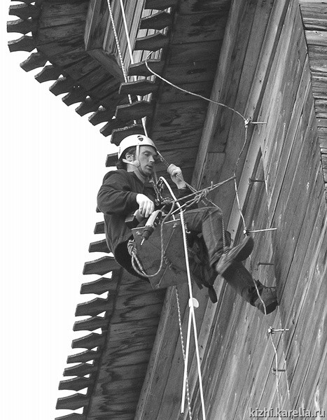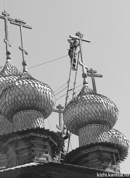 Первая система молниезащиты на памятниках Кижского Погоста, выработав свой ресурс, была заменена в 1994 году на новую, которая соответствовала третьей, последней категории защиты гражданских зданий. По нормам установка молниезащиты обязательна, если для данной местности годовое число гроз — более десяти часов — на острове Кижи среднегодовая грозовая продолжительность составляет около сорока часов. Более того, специалисты, зная число гроз, в силах рассчитать вероятное количество попаданий молнии в здание. И совсем недавно в связи с уникальностью ансамбля и легкой воспламеняемостью его деревянных конструкций, а также прогнозируемой интенсивностью гроз в ближайшее десятилетие, было принято решение о новой системе молниезащиты с самой высокой степенью защиты. «Наша задача — встретить молнию на подлете к памятникам и сделать так, чтобы она изменила свое первоначальное направление и, скользнув вдоль стены, ушла в землю рядом,— рассказывает Татьяна Сироткина, ведущий инженер музея-заповедника „Кижи“.— Поэтому молниеотвод состоит из трех основных элементов: молниеприемника, который принимает разряд молнии, токоотвода, который должен направить принятый разряд в землю, и заземлителя, который отдает заряд земле. Отличие новой молниезащиты от прежней состоит в том, что стальные составляющие системы заменены на медные. Медь обладает большей проводимостью тока и меньше ржавеет. Тем самым степень защиты объекта от молнии значительно выше». Кроме того, надежность этой молниезащиты возрастает и благодаря установке молниеотвода не только на центральных главках, но и на главках нижних ярусов церквей.