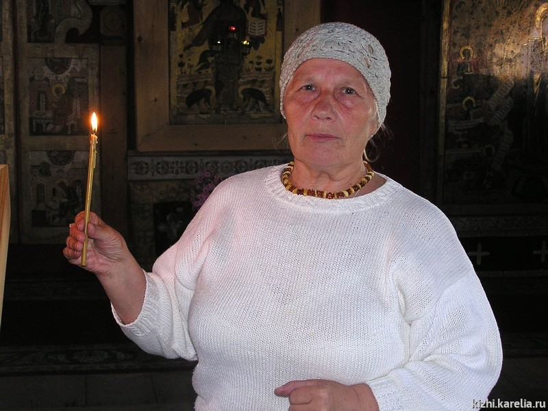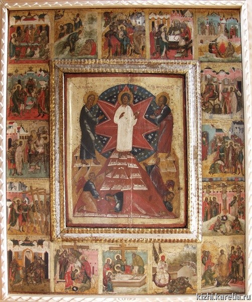 И, конечно, в иконостасе кижской Преображенской церкви храмовая икона «Преображение» занимала центральное место, сейчас она находится в Покровской церкви. «Именинница» будто сияла в окружении множества свечей, поставленных прихожанами.