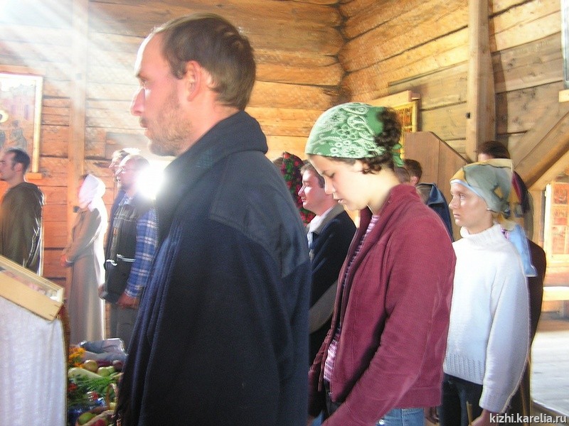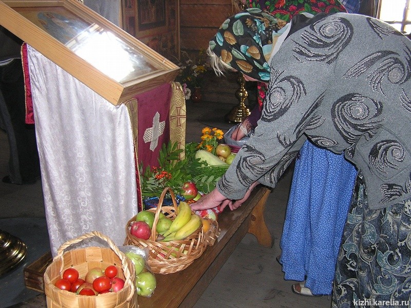В Покровском храме было особенно много прихожан. Казалось, что воздух насквозь был пропитан свежим яблочным ароматом. Ведь, по традиции, на Преображение после Божественной литургии на Руси освящают первые плоды нового урожая. Принято считать, что именно к этому сроку яблоки наливаются самым сладким соком. С самого утра кижане и жители окрестных деревень несли в Покровскую церковь, где проходила служба, корзины, туески, узелочки с яблоками и фруктами. После службы они уже были совсем другие, не садовые и покупные, а церковные — святые. «В Карелии освящаются не только яблоки, но и любые плоды и овощи. Северное лето нас не балует фруктовым изобилием. Раньше такими яблоками прихожане одаривали бедных, относили на могилы близким. Эта традиция жива до сих пор»,— рассказала нам прихожанка Раиса Андреевна Семенова.