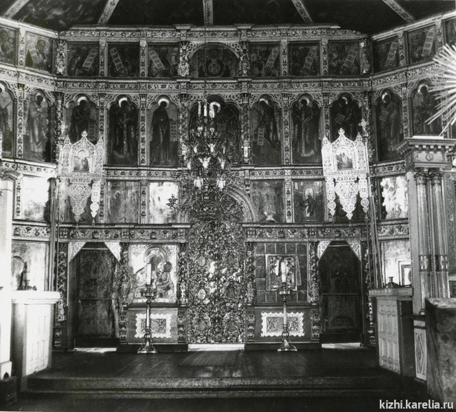 Центральная часть сруба — восьмигранник — имеет четыре прямоугольных прируба, ориентированных по сторонам света, что в плане создает равноконечный крест, в котором значительное пространство отведено иконостасу. Первоначальный тябловый иконостас имел небольшие завороты на боковые стены, затем около середины XVIII в. с введением резной золоченой рамы иконостас в значительной мере подчинил себе стенные плоскости северного и южного концов креста, разделив прирубы по средней линии. Это был один из самых крупных иконостасов в храмах Олонецкой епархии. Его высота равнялась 3 саженям 2,5 аршинам, длина — 12 саженям.