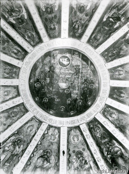 Центр пространственного креста в Преображенской церкви был усилен подкупольным «небесным» пространством*, в котором иконографическая «программа» храма получала свое логическое завершение. «Небо» состояло из 16 икон — клиньев, имевших изображения серафимов, херувимов, ангелов и праотцев, расположенных порядно. В нижнем регистре были изображены праотцы. Они, продолжая иконостасное предстояние, возводили взгляд и душу прихожанина в небесные сферы. Выше располагался ряд ангелов (по всей вероятности — «небесное воинство»). Еще один чин небесной иерархии в виде ореола из херувимов и серафимов обрамлял все изображение. Постепенное «горнее восхождение» завершалось в центре купола изображением Новозаветной Троицы («да приидет царствие твое») в окружении небесных сил (серафимов, херувимов, престолов). Замковое кольцо, обрамлявшее образ Троицы, содержит текст молитвы «Отче наш» — молитвы, которую преподал нам Господь. Замковое кольцо круговой молитвой заключало прихожанина в небесные сферы. Вертикальное подкупольное пространство имело, таким образом, определяющее значение в организации всей художественной среды храма.