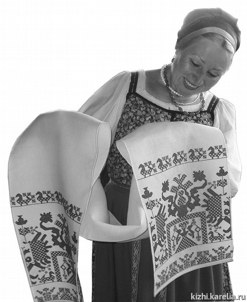 Много умелых и талантливых мастериц «Ожившей экспозиции» занимаются вышивкой: Наталья Егорова, Лидия Вершинина, Елена Хрущелевская, Вера Фролова, Анастасия Попова. Рукодельницы сохраняют древнюю традицию — вышивать праздничные и нарядные полотенца, украшать их вязаным кружевом, сложными и красивыми узорами. Девушки демонстрируют золотное шитье (вышивка по бархату золотой или серебряной нитью), досюльный (старинный) двусторонний шов, вышивку гладью, крестом. «Самый лучший оберег — вышитое полотенце, утрешься таким полотенцем, и, как считали в старину, никакой сглаз тебе не страшен», — поведала нам Лидия Вершинина, сотрудник Российского этнографического музея (Санкт-Петербург). Лидия Аркадьевна уже в течение четырнадцати лет приезжает в Кижи — поначалу просто участвовала в выступлениях фольклорно-этнографической группы музея-заповедника «Кижи», а затем очень органично влилась в программу «Ожившей экспозиции».