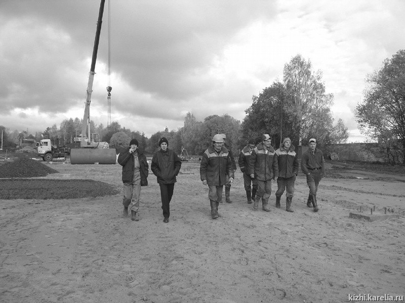 …Закончился молебен. Уехали журналисты. Строители вновь вернулись на свои рабочие места. Заработала, заворчала техника: экскаватор продолжил выравнивать площадку, подъехали КамАЗы, доверху нагруженные песком, над стройкой величаво поплыл строительный кран… Стройка вернулась в привычный рабочий ритм. Но что-то неуловимо изменилось в настроении людей. Таинство освящения позволило им проникнуться святостью кижской атмосферы, важностью исторического момента и значимостью своего вклада в огромное дело сохранения нашего культурного наследия. Теперь строители могут смотреть на все трудности островного бытия сквозь призму сознания сопричастности к великой истории России. И поистине это так.