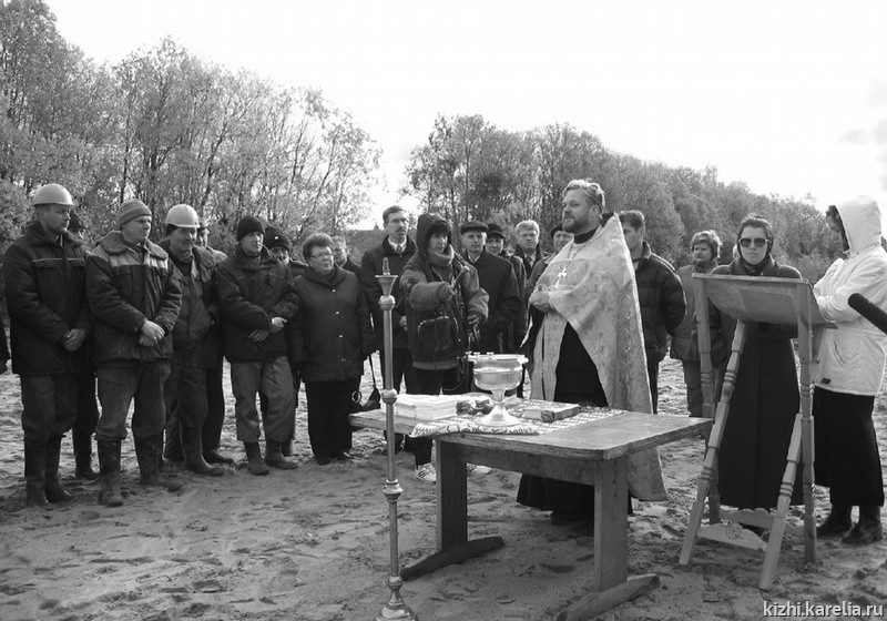 Утро выдалось хмурым и ветреным. Сотрудники музея, строители подрядной организации ЗАО «Карелстроймеханизация» зябко поеживались, отворачиваясь от пронизывающего ветра, раздольно гуляющего по ровной строительной площадке, где происходило таинство освящения.