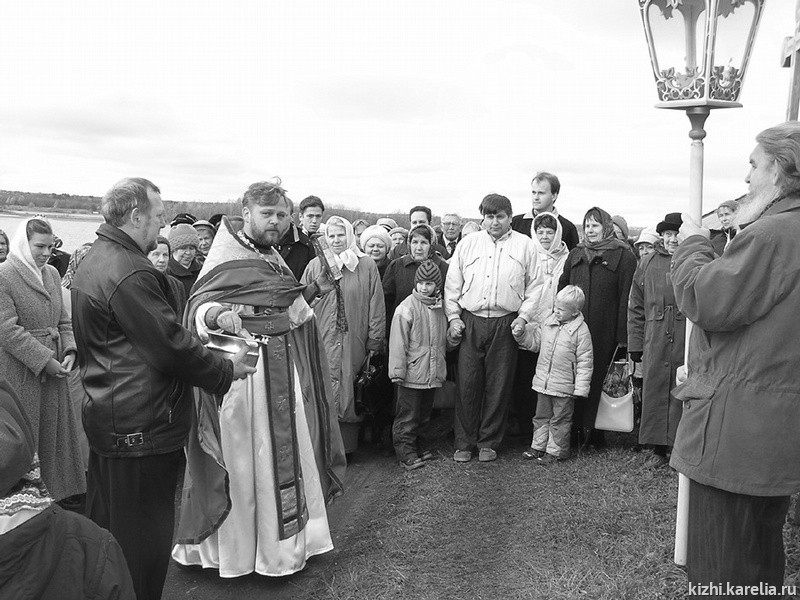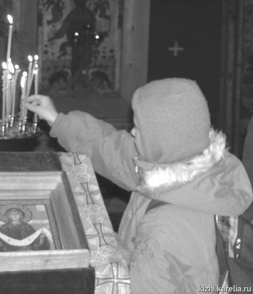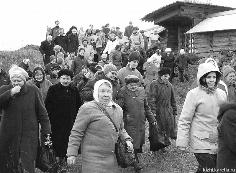В этот день прихожане кижского храма, из Петрозаводска, Великой Губы все вместе, а это более 150 человек, участвовали в торжественной литургии, которую служил отец Николай. Атмосфера старой намоленной островной церкви была пронизана добром и светом, исходившими от отца Николая и единой духовной радостью всех, принявших участие в праздничной службе. Службу украсило совместное красивое пение певчих петрозаводской Свято-Духовской церкви и кижского Покровского храма. На службе был и стар и млад: и истинно верующие пожилые женщины, и недавно пришедшие к вере молодые люди, были и просто туристы, отстоявшие всю службу — так благотворно действовало на них все происходящее. Удивительно много в храме, несмотря на прохладную погоду, было маленьких детей. Среди прихожан появились и бывшие известные карельские политики, и это особенно радует, когда по такому пути идет очищение души человеческой.