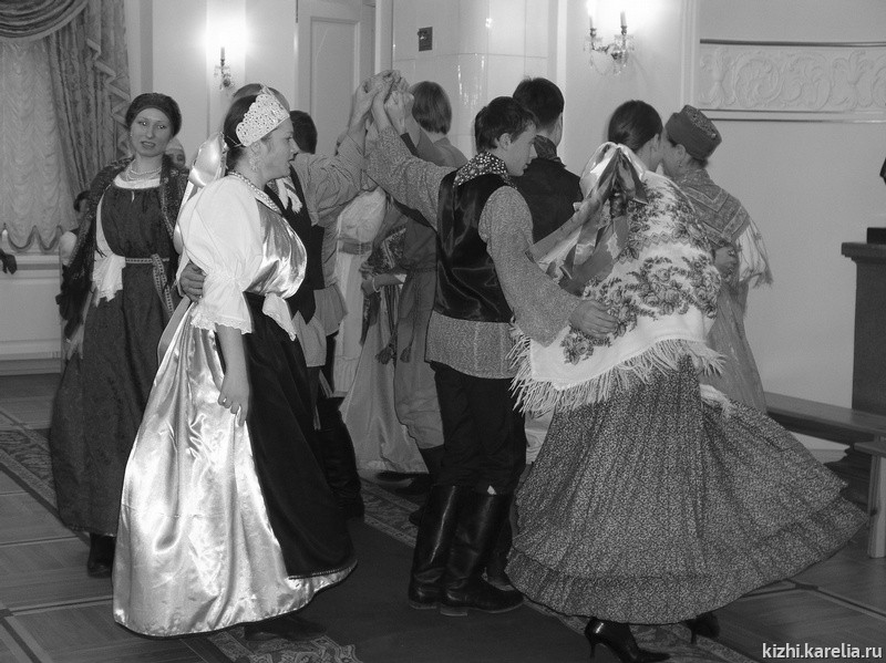 Карельские танцы, исполняемые под игру на музыкальных инструментах, появились в репертуаре ансамбля с приходом Н. С. и Е. П. Михайловых. В этих танцах с удовольствием участвуют все члены фольклорной группы — к этому располагает задающее веселый тон сопровождение на гармошке. Есть у карел и танцы, где явствен северный характер — не научившись понимать его, не станцуешь их, как следует. Некоторые из таких танцев не столь просты для освоения, как убеждались участники группы во время репетиций,— однако вот он, результат: одновременные, в такт музыке, движения исполнителей создавали ощущение северной степенности.