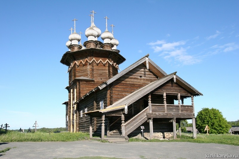 Неуютное соседство пышного многоглавия с клетской церковью продолжалось недолго: сруб клетской церкви был достроен и завершен стройным шатром по типу традиционных церквей «прионежского» типа.