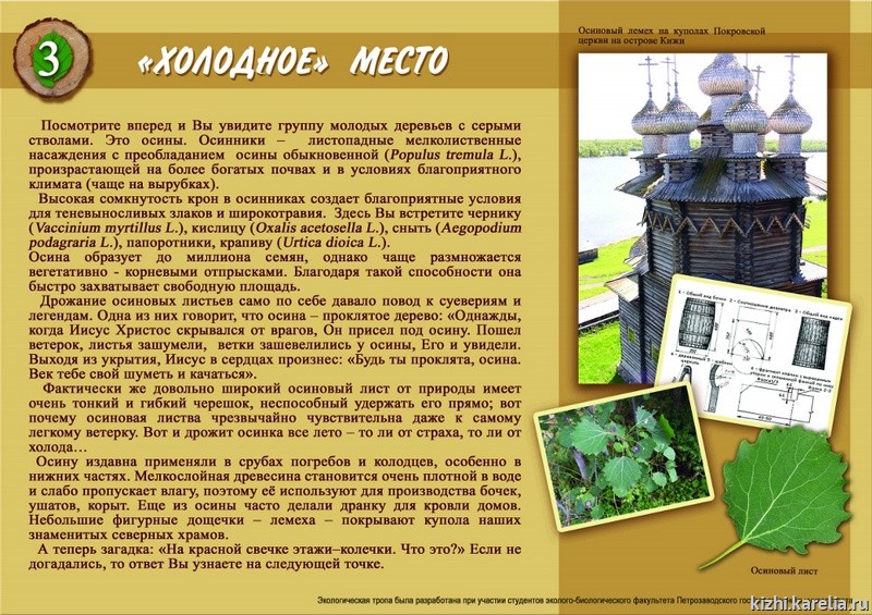 Экологическая тропа, разработанная сотрудниками отдела сохранения и мониторинга природного наследия совместно со студентами и преподавателями эколого-биологического факультета ПетрГУ, предоставляет возможность познакомится с природой этого заповедного уголка Кижских шхер и попробовать представить ту жизнь местных крестьян, которая протекала здесь на протяжении трех последних веков.