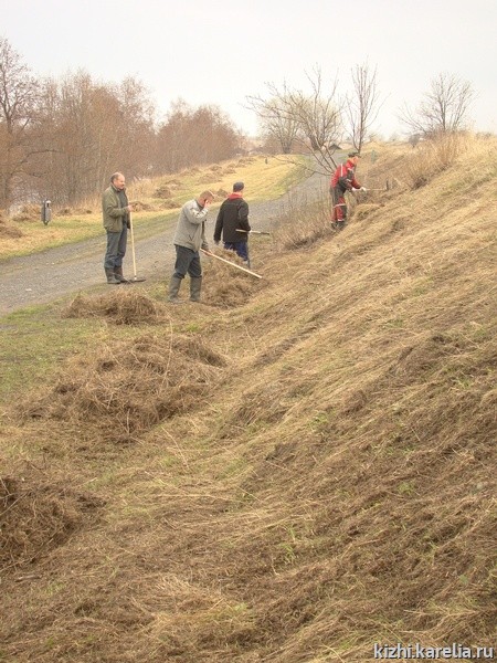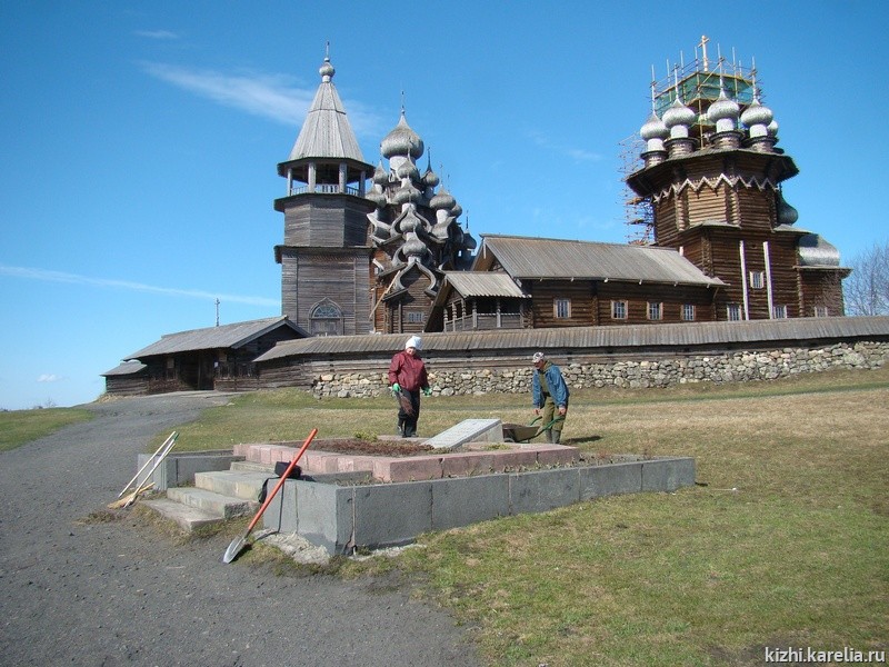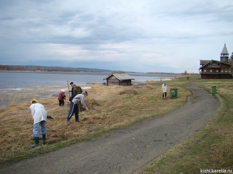 - Но конечно основная практическая работа проходила на острове Кижи. С 6 по 8 мая сотрудники музея – заповедника занимались подготовкой острова к приёму туристов. На территории основной экспозиции убрана прошлогодняя трава, удалены крепкие стебли зонтичных растений, так называемые «бодыли», убран мусор и прибитые волной брёвна и доски, древесные остатки от реставрации. Всё это погружено в тракторные телеги и вывезено на свалку. «Залечены» колеи на дорогах. Кроме этого, к великому празднику Победы произведен весенний уход за могилой партизан.