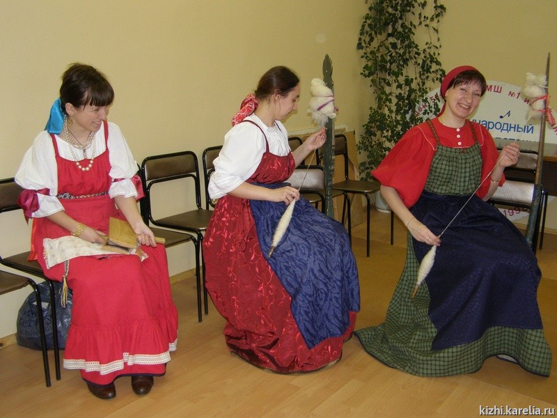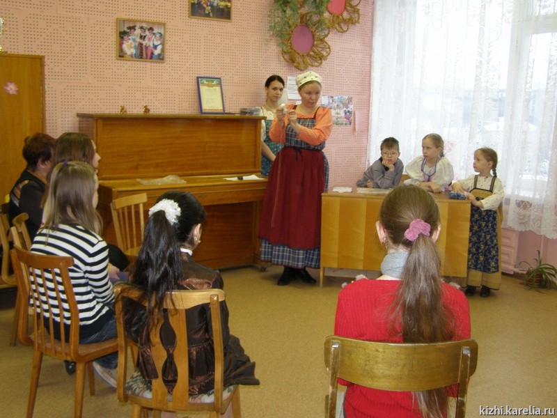 Во-первых, в концертном зале школы на сцене учащиеся исполняли музыкальные произведения, одновременно на экран проецировались картины, нарисованные юными художниками студии «Кижская палитра». Участники игры должны были определить, какая музыкальная пьеса какой картине соответствует по сюжету. Во-вторых, на одной из «игровых» станций расположились сотрудники отдела фольклора музея «Кижи», которые загадывали народные загадки о доме и об орудиях крестьянского труда. После этого нужно было с помощью старинных кард начесать шерсти и на прялке спрясть тонкую ниточку. В-третьих, уже на другой «игровой» станции участники конкурса-игры должны были изготовить народную куколку из предложенных материалов. Конечно, сотрудники музея (Михайлова Н.С., Кантор В.Е., Ригоева Н.А., участники ФЭТа Валентина Герасимова, Елизавета Гурбаева) и кураторы команд всячески помогали ребятам справиться с заданиями. Везде царила творческая обстановка, настроение у ребят было приподнятое. Нужно видеть, как ребята старались, какой интерес у них вызвали предложенные задания. Пока жюри конкурса решало, какую команду объявить победителем, Фольклорно-этнографический театр музея-заповедника «Кижи» на сцене показывал песенно-танцевальную программу, которая вызвала бурные аплодисменты. Ну, и также неподдельную радость всем слушателям подарили малыши - детская группа фольклорно-этнографического театра музея-заповедника «Кижи» (ФЭТ), исполнившая самостоятельно два танца и пригласившая в следующий танец старших участников ФЭТ. Многие зрители (родители, учителя школы) потом высказывали восторженные отзывы о костюмах, об увиденном и услышанном: «Вы напомнили нам о нашем детстве, о бабушках и дедушках, о прошлом», «Какие красивые старинные песни. Как это здорово заниматься народным творчеством!». Сценарий праздника, а это мероприятие в итоге смело можно назвать праздником, был продуман и написан преподавателем ДМШ № 1 Натальей Ширякиной.