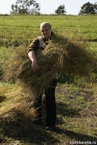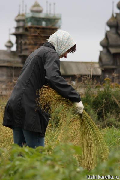 Летом 2008 года в рамках программы «Ожившая экспозиция» на оcтрове Кижи сотрудники отдела истории и этнографии начали восстанавливать работы по посеву, выращиванию и обработке льна. Это уже далеко не первая попытка вырастить и обработать лен в нашем музее. В конце 1970-х годов лен сеяла В.А. Гущина. В 1987-1988 гг. О.А. Набокова часть выращенного льна вымочила, обмяла и вычесала до получения волокна. Эти процессы были зафиксированы на фотопленку, что впоследствии позволило проиллюстрировать буклет, рассказывающий о выращивании и обработке льна в Карелии. Тогда же на о. Кижи была размещена выставка, рассказывающая о льне. Здесь были представлены орудия, при помощи которых обрабатывали лен. В 2005-2006 гг. к теме выращивания льна обратился О.А. Скобелев. Он также зафиксировал на пленку некоторые процессы обработки этого некогда очень важного для крестьян растения.