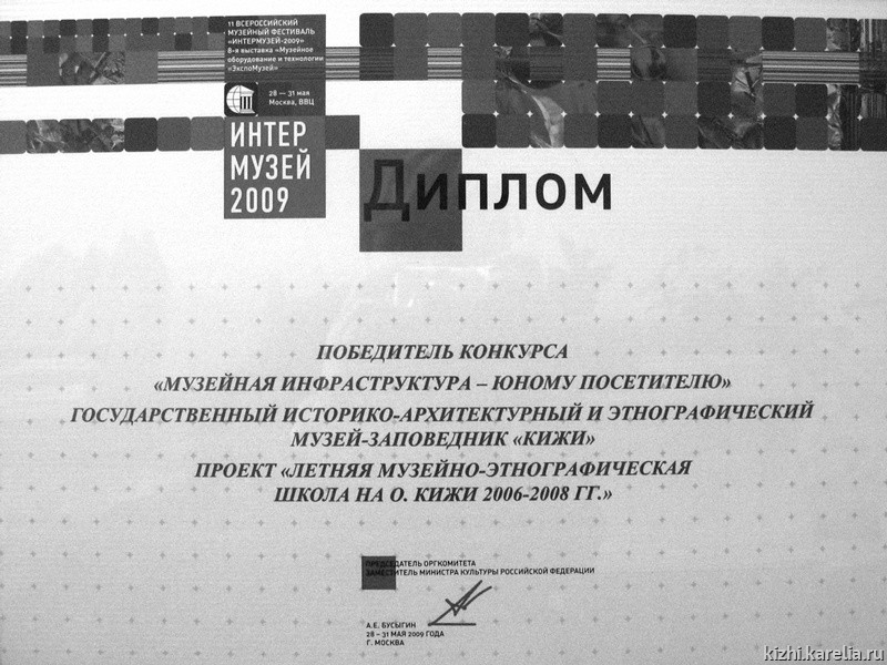 Быстро пролетели пять фестивальных дней. Остались позади усталость и волнения, защиты проектов, проведение презентаций и мастер-классов, встречи со старыми и новыми знакомыми. Осталось главное — победа музея «Кижи» на Интермузее-2009 в номинации «Музейная инфраструктура юному посетителю» с проектом «Летняя музейно-этнографическая школа на острове Кижи», автором которого является Л. В. Шилова.