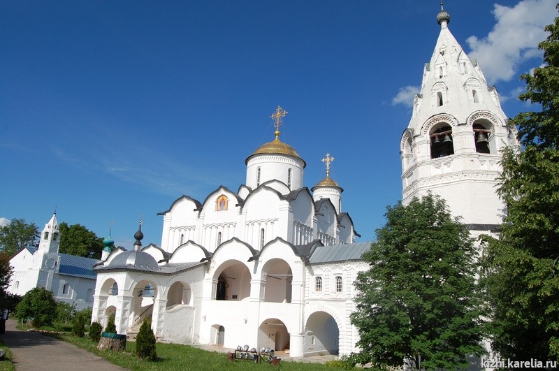 Наш путь лежит в Суздаль, в 28 километрах от Владимира. Там нас ждет гостиница, это дом суздальского купца Лихонина. Оказывается, Суздаль — совсем небольшой городок, его вполне можно обойти пешком, но памятников-то в нем сколько! Везде видны купола, главки, кресты, шатры церквей. В излучине реки Каменки — древний кремль, окруженный огромным земляным валом, а в нем — белокаменный Рождественский собор с золотыми воротами, выполненными в технике «огневого золочения». В Суздале в XIV в. было 10 монастырей! Сейчас сохранилось пять, четыре из них действующие. Покровский монастырь знаменит тем, что в нем отбывали ссылку именитые инокини, среди них — Соломония Сабурова, первая жена Василия III (отца Ивана Грозного), обвиненная в бесплодии.