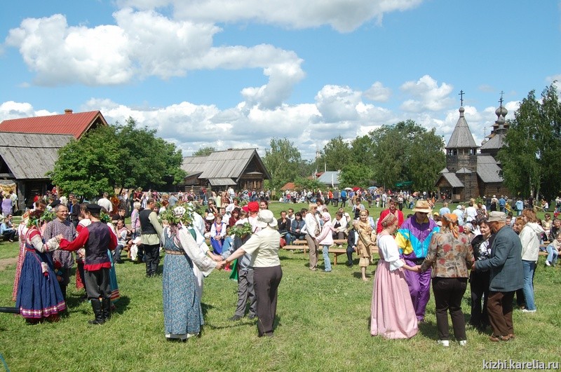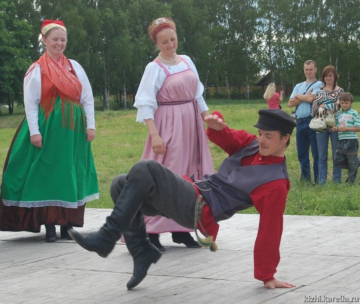 Наконец-то, наша очередь выходить на сцену. Народу очень много: здесь и жители города, и туристические группы, большие торговые ряды. Наше выступление ждут с интересом, что покажут северяне? В начале программы приветствуем всех, вручаем Алисе Ивановне (она в народном костюме, просто красавица!) подарки от музея — альбомы, книги и т. д. и поем нашу троицкую песню, потом пошли пляски, песни… На кантеле, флейте, йоухикко и гармони «зажигала» Полина Легкая,— просто молодец, не подвела! Совершенно необычно для зрителей было исполнение карельских танцев под струнные народные инструменты. Большое впечатление произвела былина о Добрыне Никитиче в исполнении О. Скобелева. Публика встречала нас восторженно, как сказали сотрудники музея, от нашего выступления повеяло стариной и подлинностью.