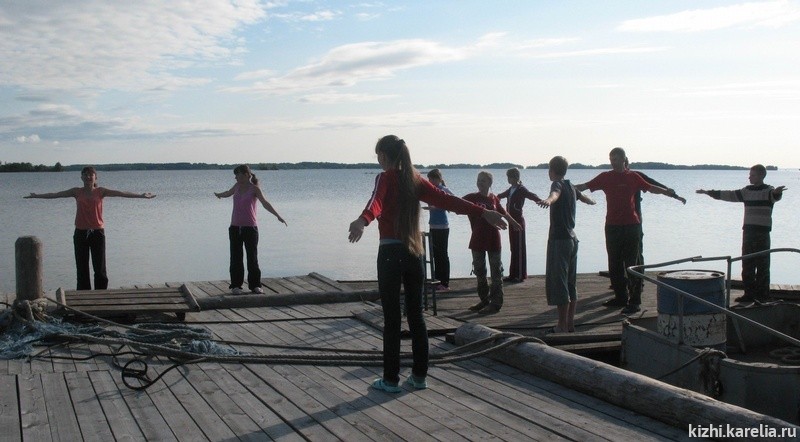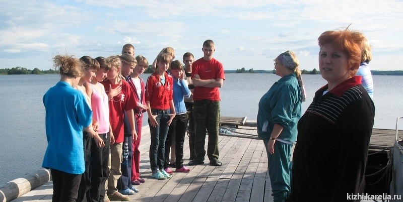 Как и у всех смен Летней школы на острове у этих ребят программа работы была насыщенная, с самого утра они были заняты делом. День их начинался с зарядки и общего построения, во время которого обговаривался распорядок дня, и ставились задачи предстоящей работы. «Ученики нашей школы (Кировской историко-краеведчекой, прим. автора) уже к этому привыкли», говорит директор школы Любовь Порфирьева. «Они приезжают со всей Кировской области в школу на сессии, которые проходят четыре раза в год по пять дней каждая. И каждое утро в школе начинается с зарядки и линейки, затем у них занятия и после обеда мы стараемся их сводить на выставки в музеи, на спектакли в театры, на разные концерты. И здесь в кижской летней школе такой же график, к которому ребята уже привыкли. Нам, конечно, это очень нравиться».