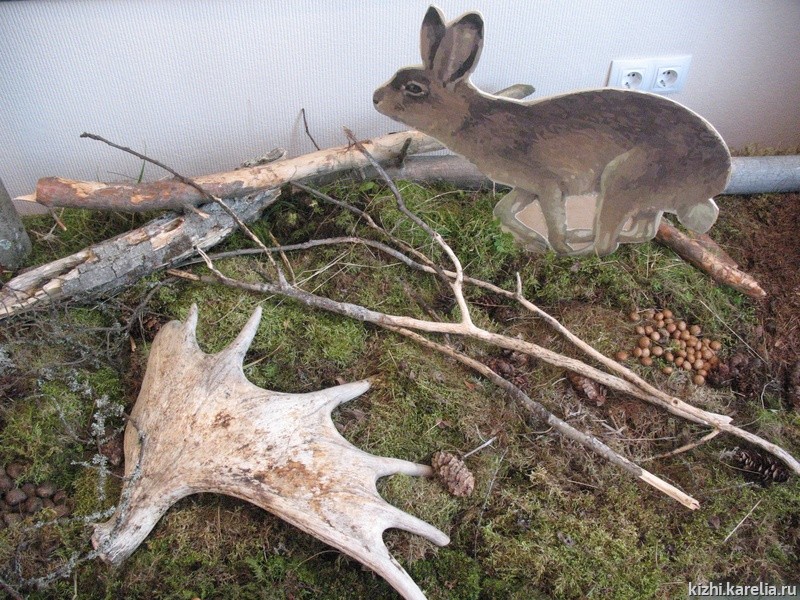 Выставка знакомит с особенностями некоторых видов насекомых, рептилий, амфибий, птиц и млекопитающих. Основные выставочные экспонаты – гнезда птиц, погрызы, спилы деревьев с ходами жуков-короедов, и другие следы жизнедеятельности животных. На выставке представлены фотографии, видеофрагменты о животных, смонтированные из материалов, отснятых на островах Кижского архипелага. Трафаретные изображения животных выполнены в натуральную величину.