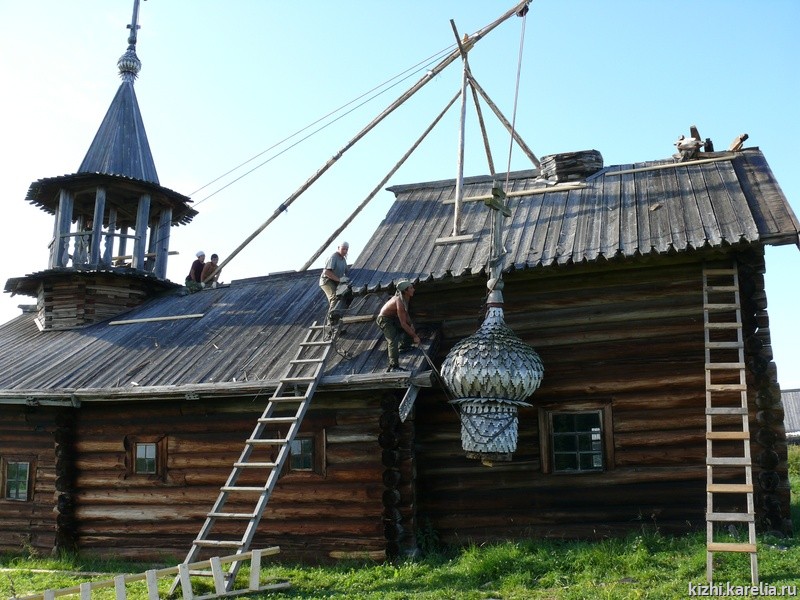 С первых же дней реставраторы столкнулись с рядом проблем. Одна из них — демонтаж главок. Задача эта технически сложная — необходимо было без помощи подъемного крана опустить их на землю. С первого захода демонтировать главки не удалось, пришлось провести дополнительные подготовительные работы, и со второго раза все прошло удачно. Ну и самая сложная и к тому же спорная проблема, которую необходимо было решать коллегиально — это замена бревен в срубе. Дело в том, что реставрация, проведенная в 1977 г., как это не печально звучит, была выполнена некачественно — при рубке новых бревен сруба, а это почти 50% замены всех бревен, с грубыми нарушениями был собран восьмерик.
