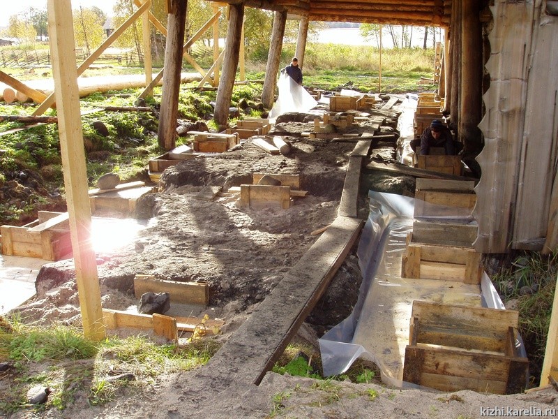 За два месяца запланированные до конца сезона работы были выполнены: разобран сруб хлевов, под хлевы подведен фундамент, уложен утеплитель в местах установки опорных столбов-»быков», собран сруб хлевов, возведены леса для дальнейших реставрационных работ, запланированных на 2010 год. На этом сезон 2009 года завершился, в течение зимы реставраторы будут заниматься заготовкой леса и пиломатериалов, а весной 2010 года продолжат работу.
