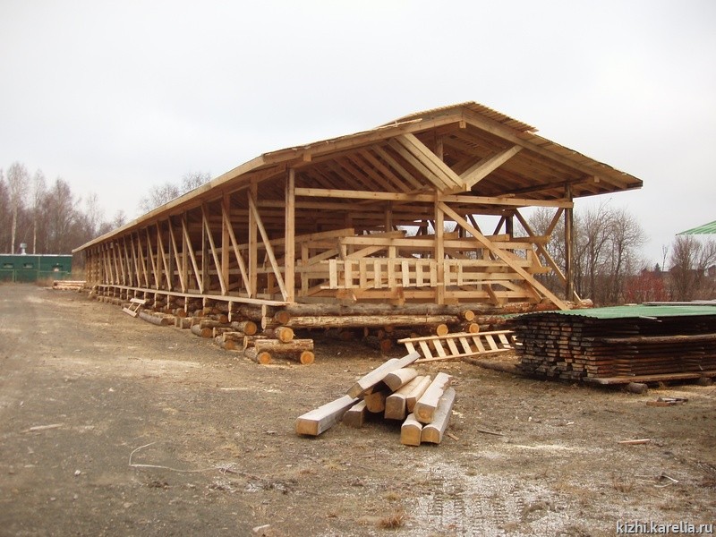 Мы уже писали о демонтаже трапезной церкви — более поздней ее пристройки XIX в. Бревна трапезной, многие из которых в плохом состоянии, очищены, вымыты, высушены, перевезены и уложены в склад, построенный специально для хранения бревен и элементов трапезной ООО «Реставрация» (г. Сортавала). Новый склад размещается на свободной территории Реставрационного комплекса.