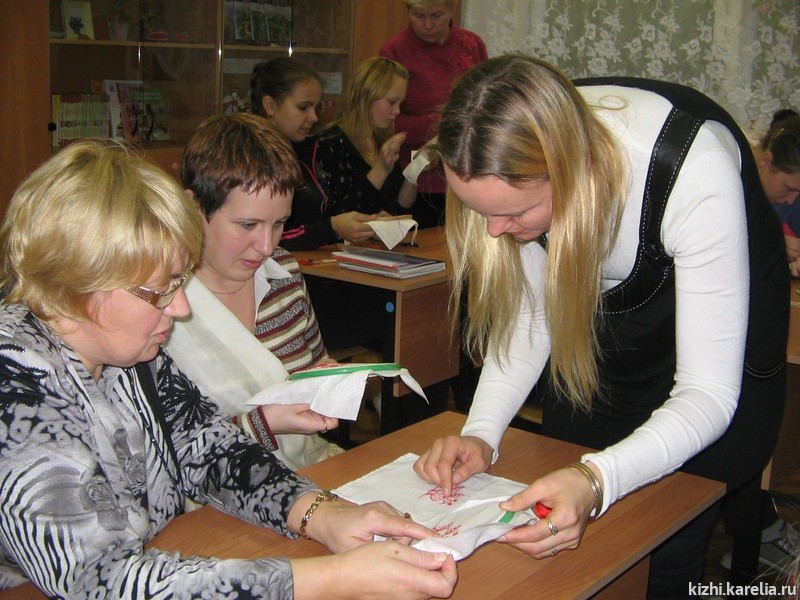 Вскоре после завершения круглого стола был организован мастер-класс для детей и всех желающих. Приятно было узнать, что музей-заповедник «Кижи» запланировал на будущий год проведение подобных мастер-классов по заонежской вышивке в с.Шуньга и г.Медвежьегорске. Не исключены и другие формы поддержки будущих мастериц из Шуньги со стороны музея «Кижи». ООО «Карельские узоры» в свою очередь также готовы оказывать помощь в реализации изделий из Шуньги через свою торговую сеть.