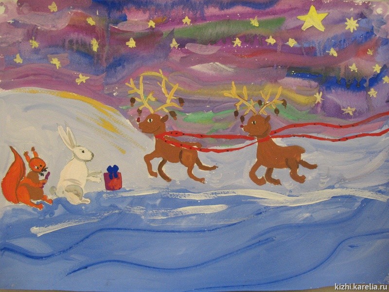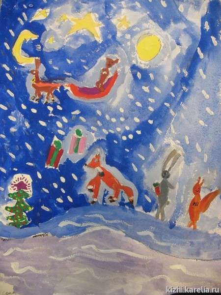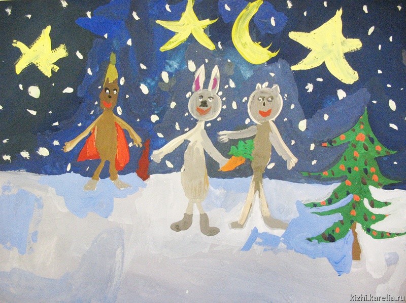 На острове Кижи была необычайная ночь. Небо было звездным и чистым, и как будто ниоткуда шел снег. На лесной поляне сидел маленький заяц смотрел на звезды. К нему подбежал бельчонок.