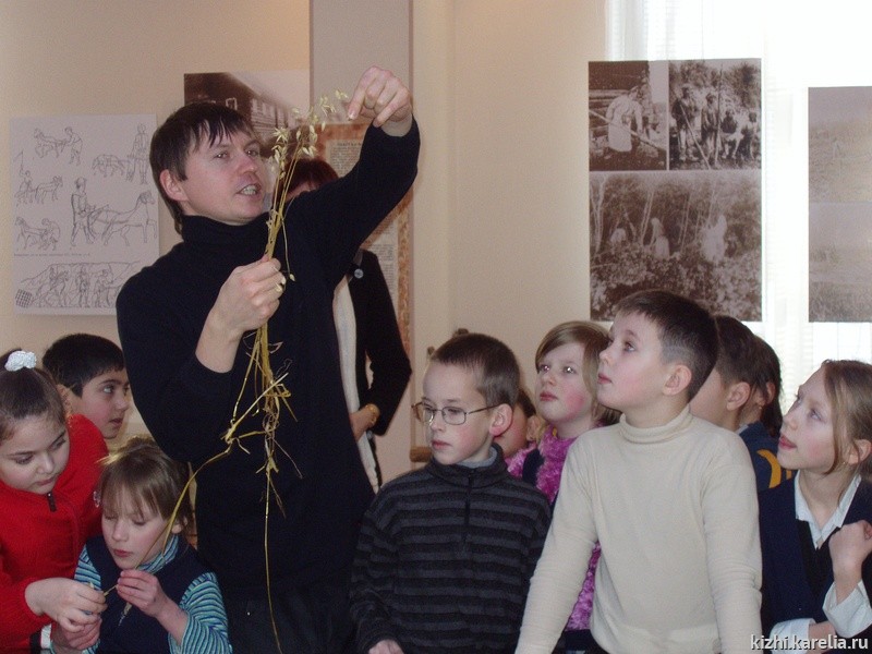Побывали гости на экскурсии «Традиционное земледелие Олонецкой губернии. Конец XIX — XX века». Это увлекательный рассказ о годовом круге земледельческих работ, которые начинаются спустя некоторое время после Масленицы. Кроме того, посетители могли увидеть все орудия земледельческого труда наших предков: от сохи до цапки, от бороны до кичиги. Попробовали сами веять овёс, молоть зерно на муку настоящим каменным жёрновом, собрать муку птичьим крылышком.