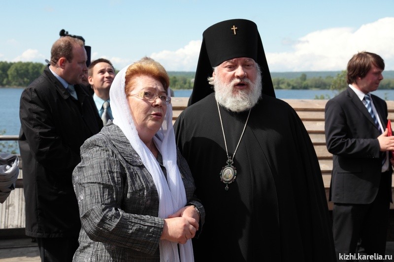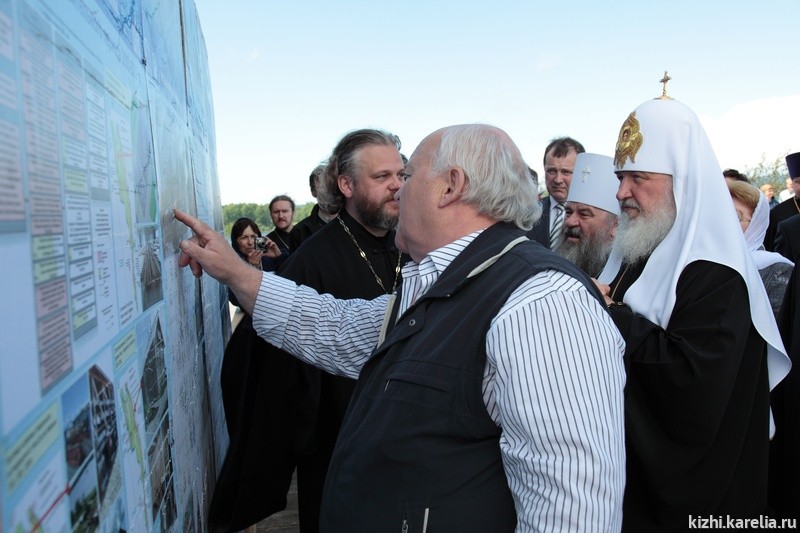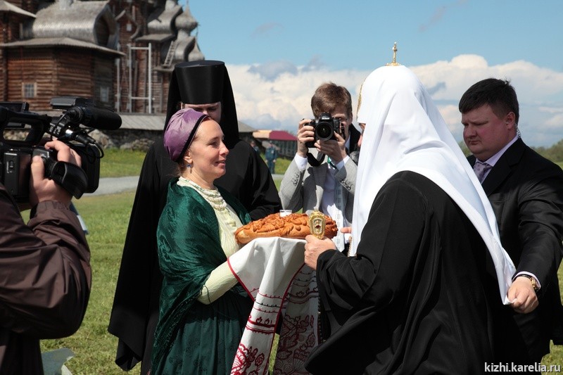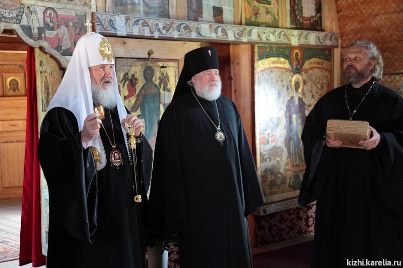На острове Кижи Патриарха Кирилла встречали директор музея-заповедника, засл. работник культуры РФ Э. В. Аверьянова и настоятель Спасо-Кижского Патриаршего Подворья протоиерей Николай Н. Озолин, который накануне знакомил Патриарха с приходским домом Подворья в г. Петрозаводске.