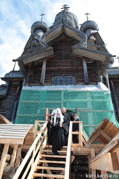 Познакомился Патриарх и с уникальным памятником русского деревянного зодчества — единственной в мире деревянной двадцатидвуглавой церковью Преображения Господня 1714 г., сегодня находящейся на реставрации. Заместитель директора музея «Кижи» по реставрации памятников Кижского архитектурного ансамбля Н. Л. Попов провел для гостей подробную экскурсию по реставрируемому памятнику.
