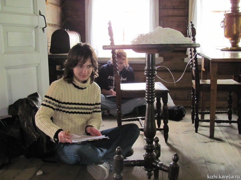 Перед непосредственным выполнением практической работы участники проекта «погрузились» в предметный мир крестьянской культуры, изучали интерьер и экстерьер северного дома на занятиях ст.н.сотр. отдела истории и этнографии В.А.Гущиной. С традиционной материальной и духовной культурой Заонежья участники проекта познакомились во время экскурсии, которую провела для них нач. отдела истории и этнографии С.В.Воробьева. Огромный интерес будущих художников, дизайнеров и искусствоведов вызвали занятия в фондах и знакомство с коллекциями «Металл», «Дерево», «Древнерусская живопись» музея-заповедника «Кижи». Глубокое изучение предметного мира крестьянской культуры позволило успешно выполнить проект: обмеры предметов мебели в домах-памятниках Заонежья: Ошевнева, Сергеева, в пудожском доме Бутина и в доме карельского крестьянина Яковлева. Надеемся, что материалы обмеров (после камеральной обработки в академии) будут ценным материалом для фондовой документации музея-заповедника «Кижи», а описания предметов декоративно-прикладного творчества, интерьеров, выполненные студентами-искусствоведами, также могут быть полезны для музея. Более 20 этюдов, на которых запечатлены необыкновенная природа, памятники архитектуры острова Кижи, предметы крестьянской утвари, увозили с собой студенты в Москву. Осенью в стенах прославленной академии состоится выставка их работ, а в октябре мы надеемся увидеть эти работы на творческом отчете групп Летнего университета.