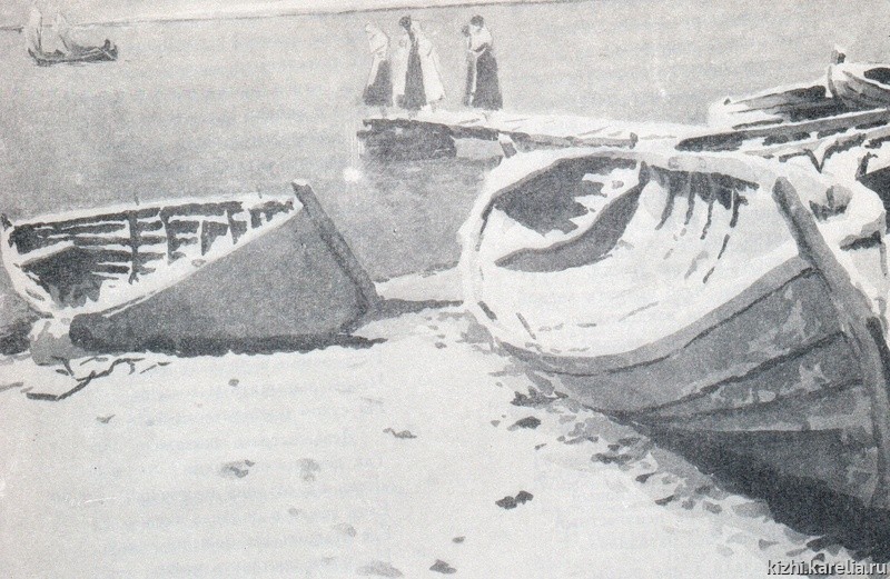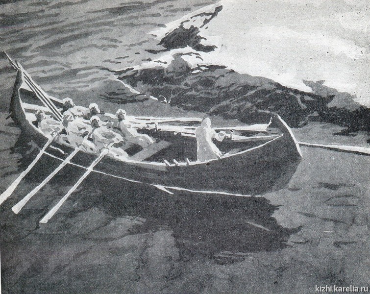 Листая книгу, я с удивлением и радостью увидел, что все лодки героев-калевальцев — точные копии известных лодок-кижанок. Долгое время, до приобретения своего дома на Бараньем Берегу, Мюд Мечев жил в доме лодочника Семёна Ивановича и хорошо изучил лодки, которые он шил, — самые лучшие, как считалось в Логмозере. При внимательном рассмотрении иллюстраций с лодками видно, что на всех рисунках изображена одна и та же лодка, которая примерно в то же время получила заслуженное название — «кижанка», потому что рядом с островом Кижи на Волкостровской верфи строили каждый год 100 — 150 традиционных онежских лодок.
