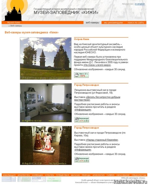 Однако одним из самых посещаемых ресурсов проекта стала web–камера на острове Кижи, направленная на Кижский архитектурный ансамбль, ставшая одной из самых первых музейных web–камер в России (http://kizhi.karelia.ru/webcams/). Оборудование было приобретено на средства гранта. Устанавливал первую web–камеру в 2005 году сотрудник отдела информации – Роман Колосов. В 2009 году появилась возможность обновить оборудование. И новую web–камеру устанавливал инженер отдела информации – Сергей Гринь. В течение пяти лет посетители сайта могли видеть остров Кижи в разное время года и суток, в разных погодных условиях. В среднем страницу с on-line трансляцией с острова Кижи посещает около 2000 пользователей сети Интернет в месяц. Таким образом, реализация данного проекта позволила создать прецедент организации реставрации столь значимого объекта культурного наследия в буквальном смысле на глазах у всего мира.