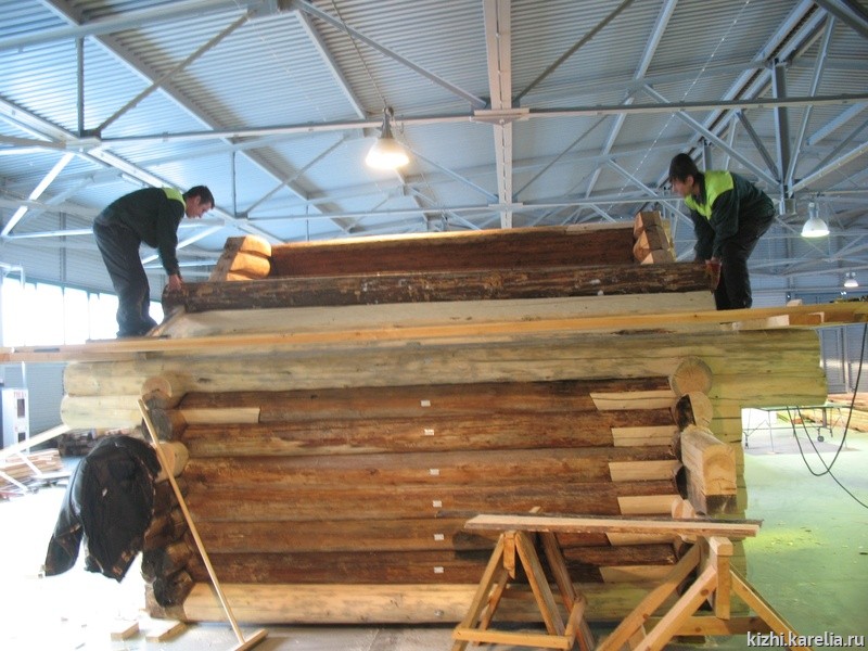 Амбар был промаркирован, полностью разобран и перевезен в закрытое помещение — Реставрационный комплекс музея «Кижи» в деревне Васильево — где и была выполнена поэлементная реставрация сруба с помощью накладок коронок, а также протезирование деструктированных бревен. При реставрации бревен использовался клей производства шведского концерна «Akzo nobel». Использование клея при реставрации бревен на памятнике XVIII века явилось своего рода экспериментом, который прошел успешно. Приобретенный опыт будет применяться в дальнейшем и на других памятниках деревянного зодчества в музее-заповеднике «Кижи».
