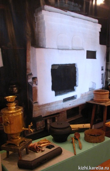 Когда находишься перед баннером с фотографией русской печи, а рядом на лавочках — глиняные миски, мутовки и разная другая утварь для приготовления еды, невольно представляешь себя в крестьянском повседневном костюме XIX века за приготовлением обеда для большой семьи. В другой части зала представлены предметы из фондов музея — это ведра, корыто, стиральная доска, камни, которыми кипятили воду, и щипцы для них, рубель, скалки и вальки, прялки, образцы крестьянской одежды.