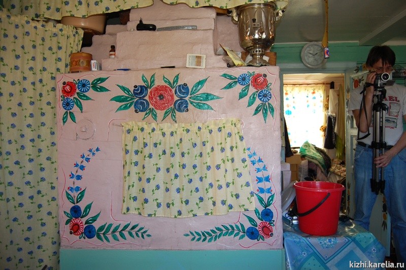 На улице никого… Наконец, показалась женщина с пустыми ведрами, прошла через скалу и исчезла в лесу, обратно не вернулась… Спросить, кто нас возьмет пожить, некого. Как потом оказалось, устроиться несложно, в селе давно привыкли к приезжим людям, сюда в летнее время устремляются москвичи половить рыбку (перегораживают реку Гридинку семге, идущей на нерест), приезжают художники на пленер, геологи, нашедшие здесь редкостную древнейшую породу, а также гости местных жителей. Наконец, мы устроились в доме Ирины Филипенко. В ее лице мы нашли родственную душу: Ирина занимается сбором сведений по истории и быту села, ведет записи, составляет словарь местного говора. Кроме того, она художник-прикладник, любит расписывать все, что ее окружает: печь, двери, доски, прищепки, туфли, ноутбук, бердышко, игрушки, кошельки, сумки… Сама сшила поморский сарафан, приобрела старинные чепцы – что для коллекции, что для своего наряда.