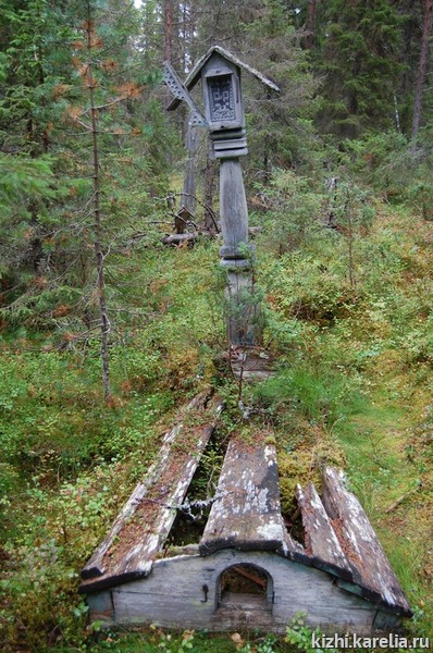 Удивительно разнообразные, с резными причелинками и охлупнями в виде птицы; еще сохранились два намогильных срубца – домика, уже совсем ветхие. Во второй раз мы посетили кладбище с группой местных жителей, в день, когда одна из наших исполнительниц поминала свою подругу. Они пришли с поминальной едой и кадильцем. Нам удалось отснять поминальный обряд.