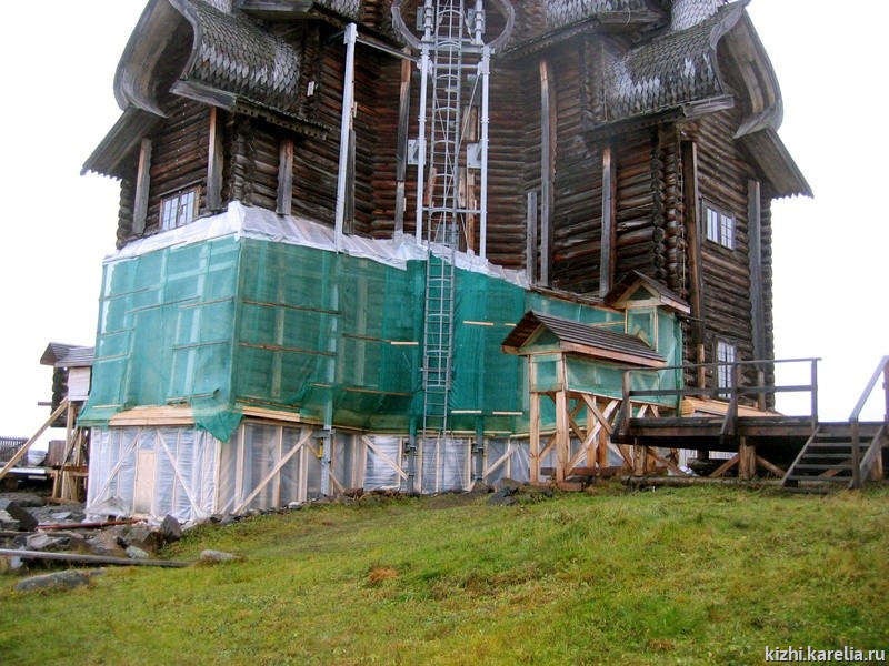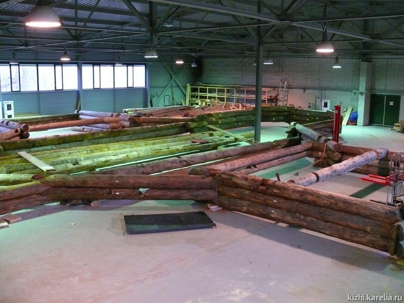 Но работа реставраторов музея не останавливается. В закрытом производственном комплексе силами сотрудников Плотницкого центра произведена дореставрационная сборка пяти венцов демонтированного пояса. Дело в том, что за 300 лет нижняя часть церкви сильно деформировалась и балки вышли из своих исторических гнезд, тем самым геометрия сруба была нарушена. При его сборке реставраторы стремятся к исходной геометрии памятника на момент его строительства. Получившийся локальный объем сруба позволяет четко представить, какие обследования, замеры, чертежи делать по каждому бревну и как его, исходя из этого, реставрировать.