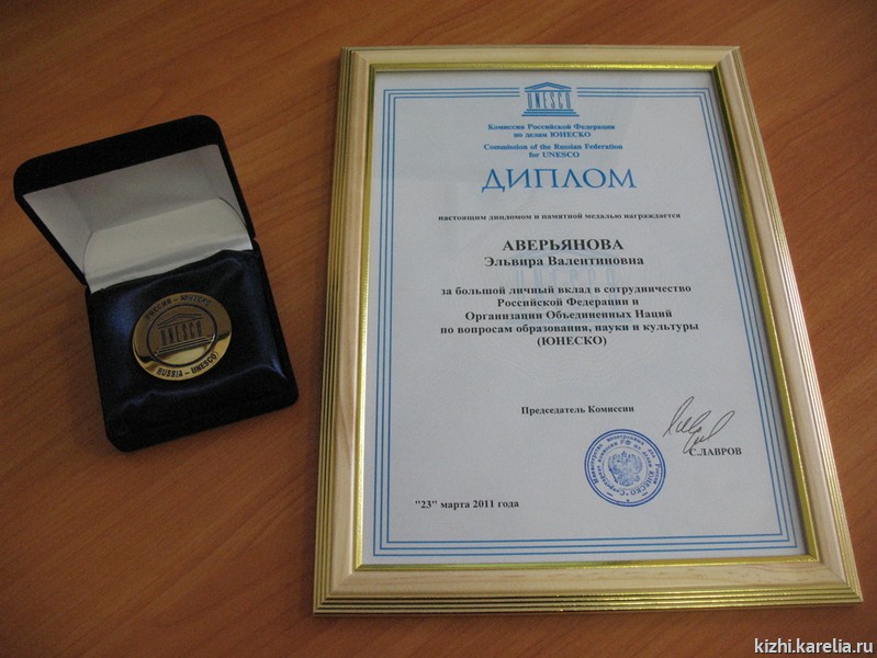 За большой личный вклад в сотрудничество Российской Федерации и Организации Объединенных Наций по вопросам образования, науки и культуры (ЮНЕСКО) директор музея-заповедника «Кижи» Эльвира Валентиновна Аверьянова была награждена почетным дипломом и медалью ЮНЕСКО.
