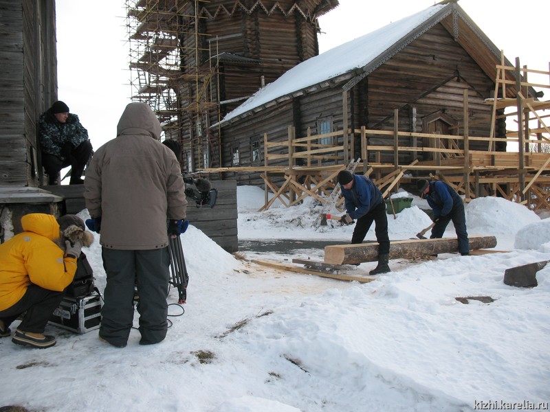 Съемочную группу интересовала не только реставрация памятника ЮНЕСКО, но и все, что связано с жизнью Кижского погоста. На второй день съемок она стала свидетелем первого молебна, который отслужил в Покровской церкви новый священник Спасо-Преображенского прихода на острове Кижи отец Артемий. А потом на колокольне более двух часов на ледяном ветру японцы снимали кижские звоны в исполнении И. Хуттера. Не скажу, что это подвиг, но что-то героическое в этом определенно есть...