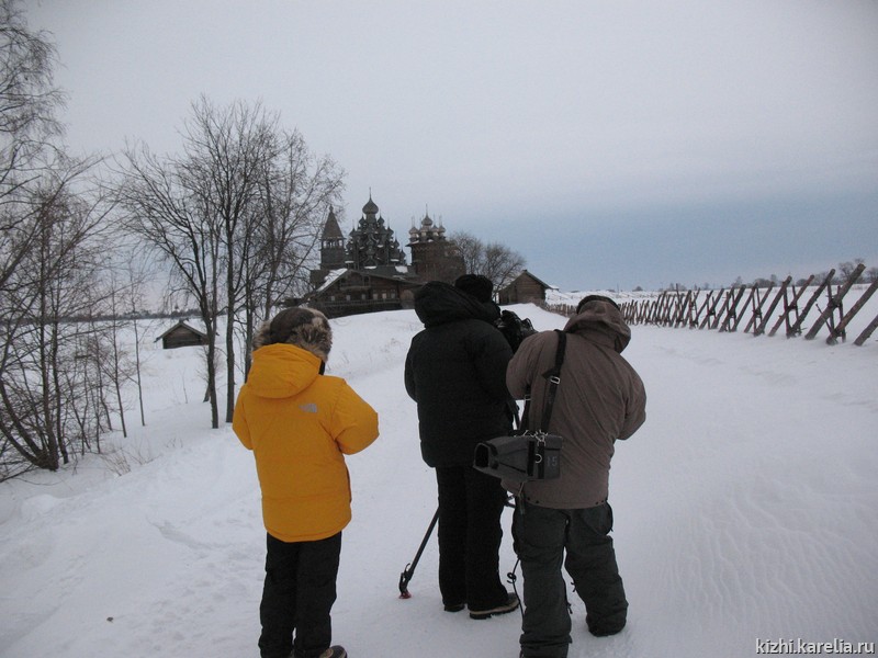 Основная работа на острове Кижи проходила с 9 по 12 марта. Съемочные группы из Японии уже трижды бывали на острове Кижи, но данная съемочная группа впервые работала в России, где их сопровождала опытный японист и переводчик Этери Саконтикова (г. Москва). Со стороны музея-заповедника «Кижи» обеспечением работы съемочной группы занимались, как обычно, сотрудники пресс-службы музея, транспортного отдела, Плотницкого центра, отдела учета и хранения недвижимых памятников, АХЧ и специалисты-реставраторы, а также сотрудники Службы безопасности и ПЧ-14. Г. Мозгова, администратор Дома специалистов, где размещалась съемочная группа, устроила для гостей настоящую четырехдневную презентацию русской кухни.