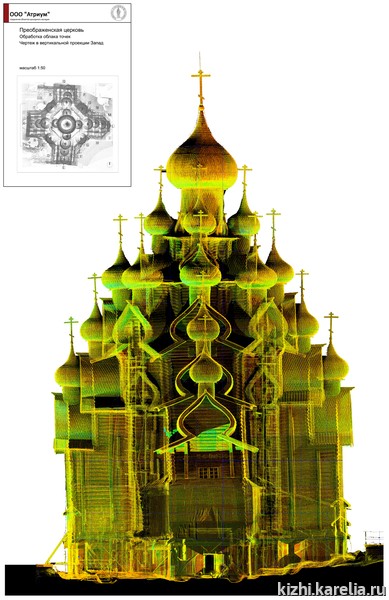 Лазерное сканирование чаще всего используется на крупных промышленных объектах, таких как электростанции, мосты, цеха. Сканирование памятника архитектуры в нашей стране — редкость. Сканирование памятника деревянного зодчества на таком уровне проводилось, пожалуй, впервые. По словам оператора, выполнявшего сканирование, уровень сложности сканирования Преображенской церкви сравним с наиболее сложными промышленными объектами.