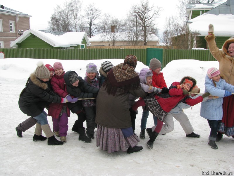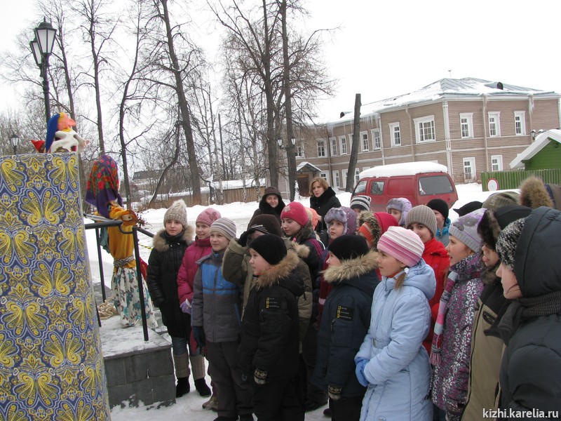 Масленица в музее «Кижи» проходит так, что и школьников, и туристов ежегодно доброжелательно и весело встречает музейный Фольклорно-этнографический театр. Каждый год именно в нашем музее можно услышать и увидеть кукольный театр озорного Петрушки. Притом, уже не первый год в представлении участвуют самодеятельные актёры театра ПетрГУ и КГПА – двух высших учебных заведений нашего города – Николай Артёмов и Ксения Соколова.