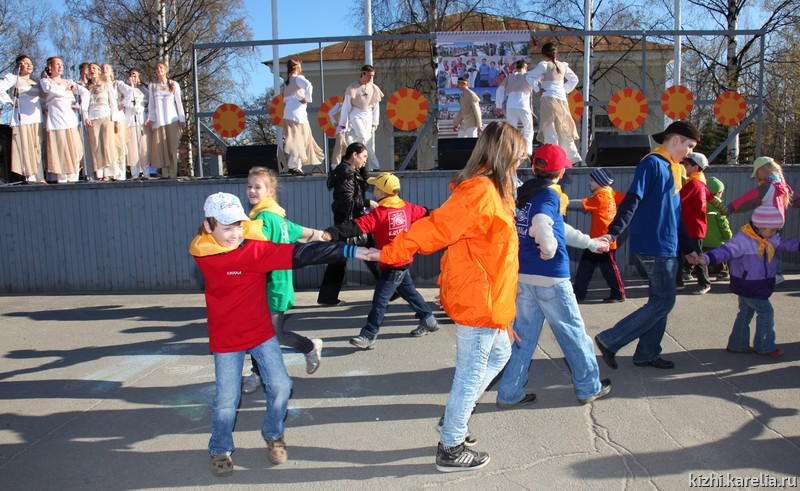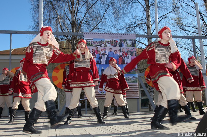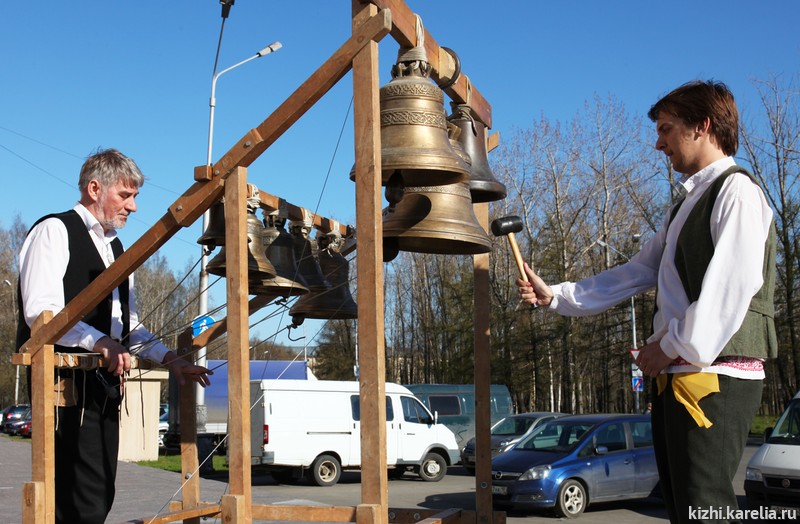 Праздничная программа музея «Кижи» продолжилась выступлением ансамбля народной музыки «Тойве» — все желающие могли насладиться песнями и танцами финно-угорских народов Карелии в исполнении студентов Петрозаводского государственного университета. Творческую эстафетную палочку перехватил звонарь Игорь Архипов, и вскоре над площадью разлились величественные звуки колоколов передвижной кижской звонницы. Колокольные мелодии не всегда были гармоничны: это пробовали свои силы те, кто отважился принять участие в мастер-классе по звонарскому мастерству.