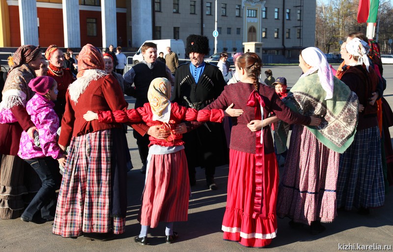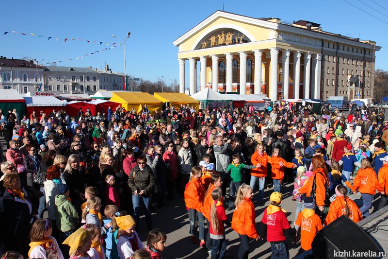 И еще какое действо! Более 600 участников фольклорных коллективов города пришли в гости к музею «Кижи», чтобы устроить масштабный «фолк-моб». Что же скрывалось за этим загадочным словом? В едином порыве творческие коллективы города пустились в пляс и завели огромный хоровод-круугу. В руках у участников акции были платочки ярко-желтого «солнечного» цвета, они позволили сделать и без того внушительный хоровод еще более длинным.