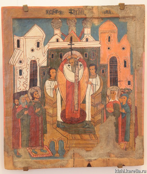 С конца XVII в. в часовнях начинают сооружаться многорядные иконостасы, а сверху интерьер молельни осеняется расписным «небом». Традиционное убранство трапезной дополняется иконой «Страшный суд», а также иконами на нравоучительные сюжеты. Художественное убранство интерьера становится полифоничным, оно раскрывает идею премудрого Божественного созидания мира, соединяет сюжеты Ветхозаветной и Новозаветной истории во взаимосвязанную цепь событий. Для периода конца XVII начала XVIII веков характерны иконы крупного формата, заполняющие местные ряды иконостасов не только в церквях, но и в часовнях. Типичным примером является икона «Сошествие во ад» из Успенской часовни деревни Васильево на острове Кижи, экспонируемая на выставке. Над украшением часовен немало потрудились мастера-староверы поморского беспоповского согласия из Выго-Лексинского общежительства. Иконо-стасы старообрядческих часовен были большими живописными ансамблями и включали множество икон. Произведения староверов высоко ценились и православным населением Заонежья, которое заказывало им иконы.