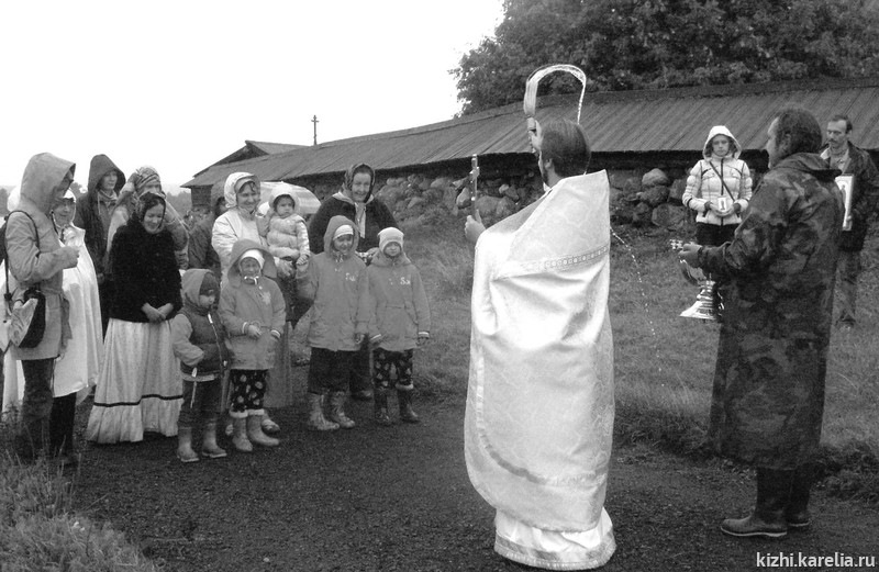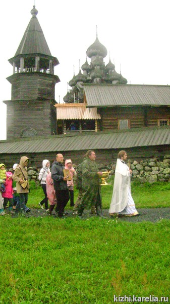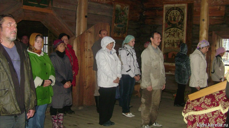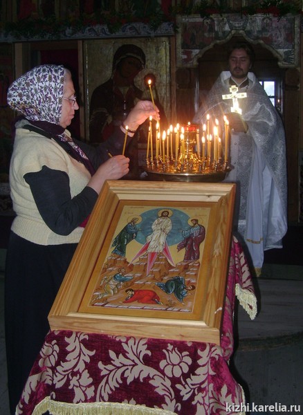 Преображенская церковь Кижского погоста уже много лет закрыта на реставрацию, поэтому Божественную литургию в честь праздника по сложившейся островной традиции принимает у себя ее младшая сестра — Покровская церковь.